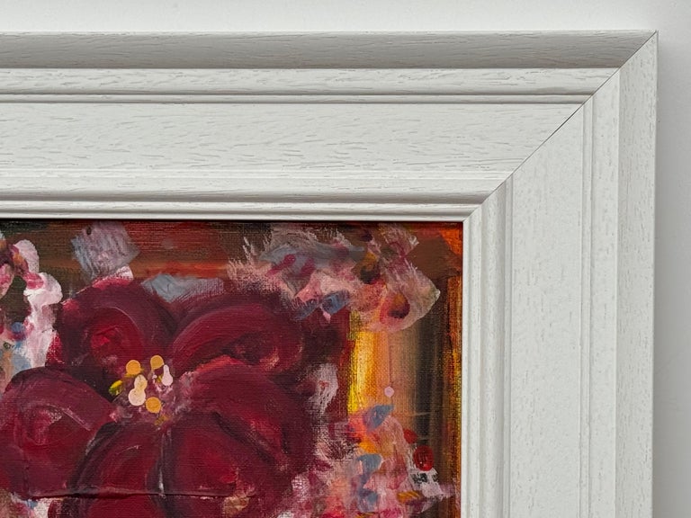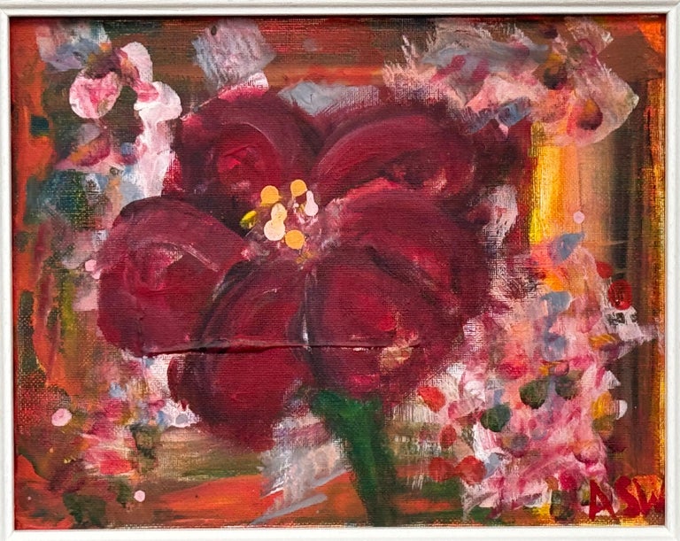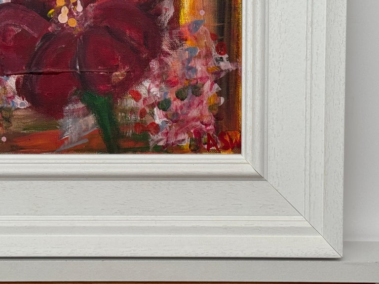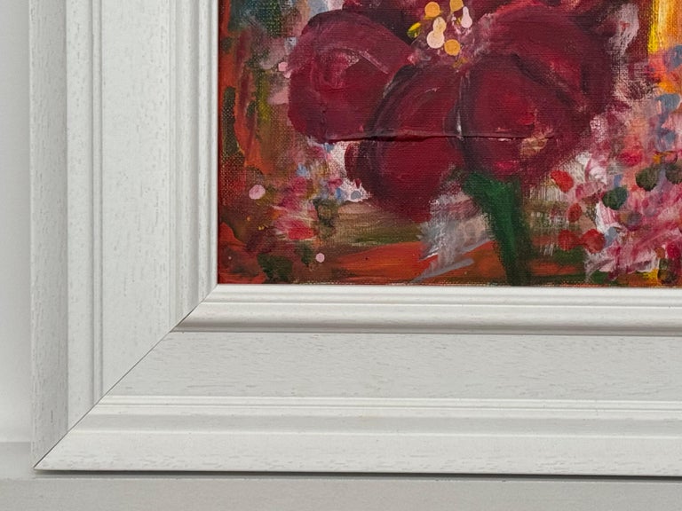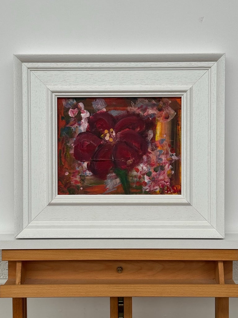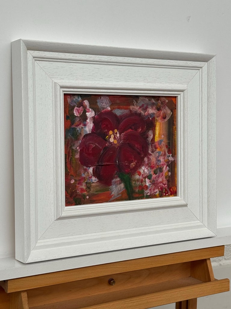 An intimate and richly expressive early work by renowned British artist Angela Wakefield, this small-scale study of an Amaryllis reveals the foundations of her distinctive painterly voice. Bold, gestural brushstrokes form the velvety deep crimson petals, contrasted with delicate daubs of pink and white that suggest surrounding blooms or falling light. The backdrop is warmly abstracted, with hints of ochre and sienna peeking through layers of floral atmosphere.