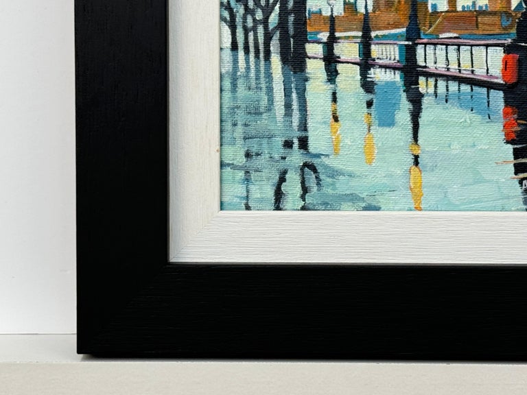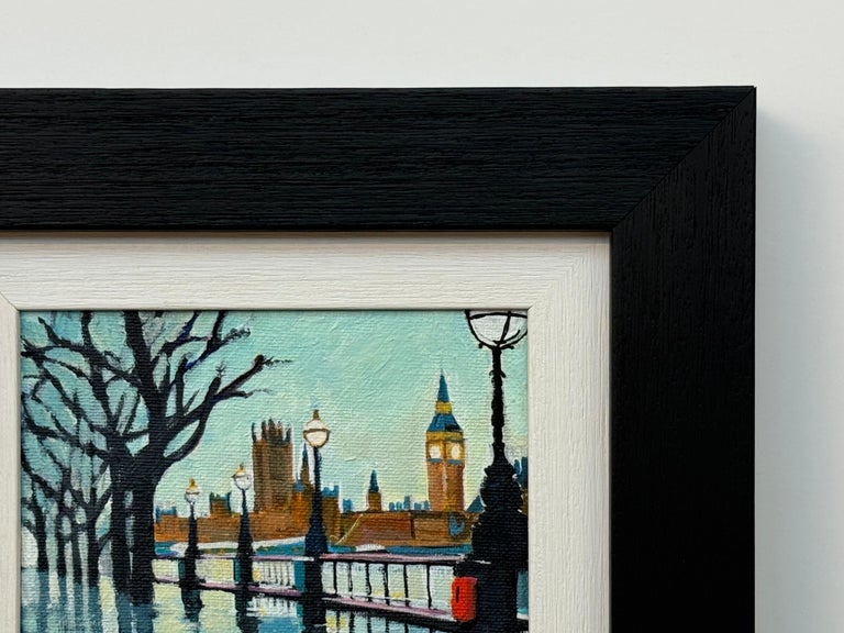 Miniature Painting of Victoria Embankment London & Houses of Parliament, Westminster in the Rain – a unique original from leading Contemporary Cityscape Artist, Angela Wakefield. Part of the London Collection.