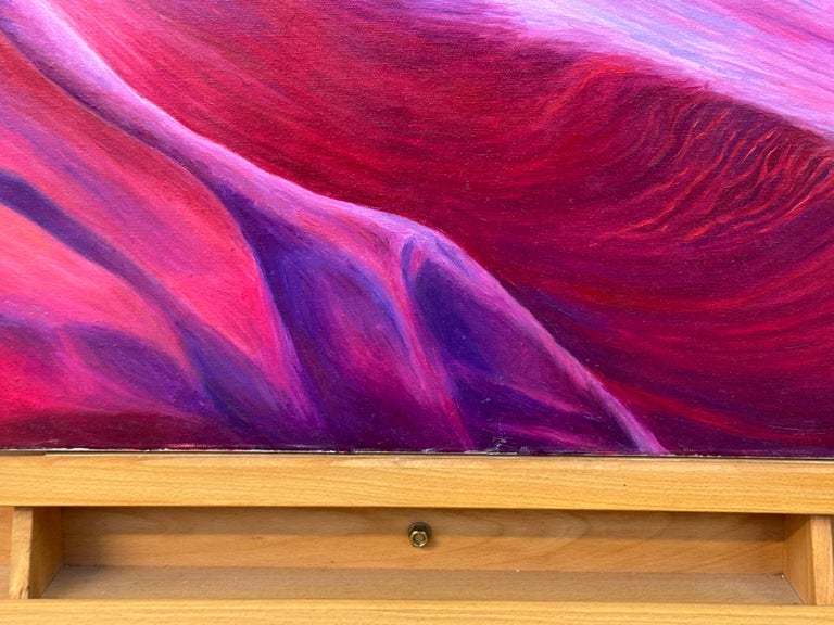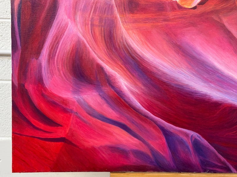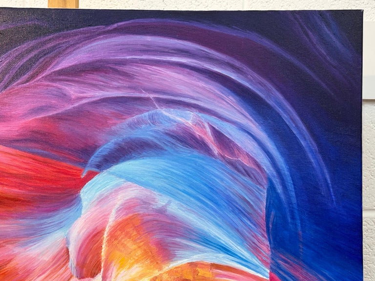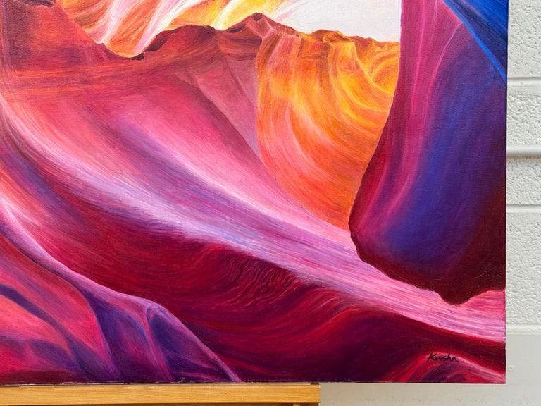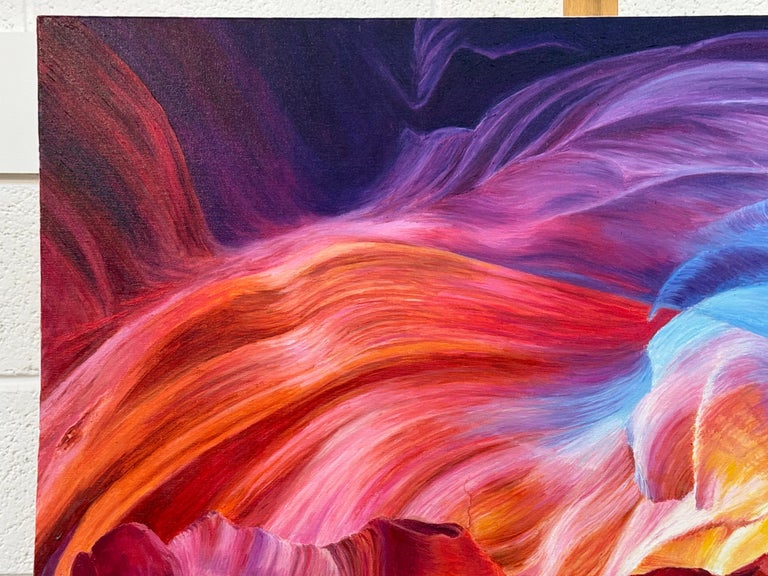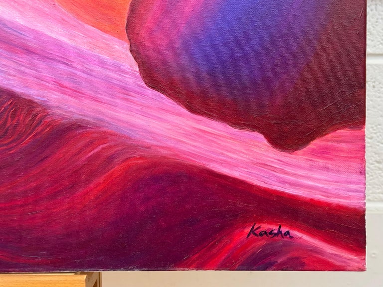 Large Square Red Pink Blue & Purple Painting of inside Antelope Canyon in Arizona USA, by Polish Artist Katarzyna Szulc. This original oil painting is part of an inspired body of work based on one of the most significant rock formations in the world – the Grand Canyon. Signed Kasha on the front of the canvas.