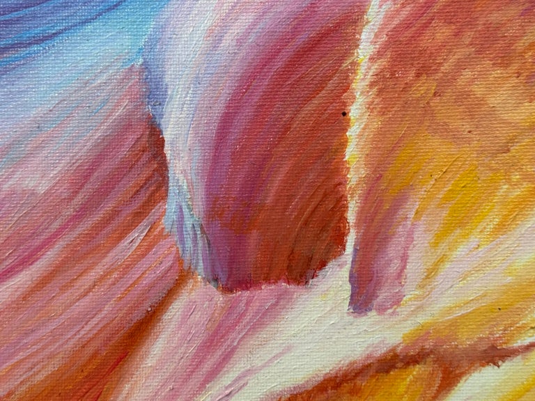 This striking painting is a radiant highlight from a devoted series centered on the Grand Canyon—an abstracted, almost celestial vision of one of Earth’s most iconic landscapes. Here, the artist captures a sense of motion and energy rarely seen in canyon-inspired work. The composition curves and spirals like a cosmic wave, drawing the viewer into its vibrant vortex of colour and light.