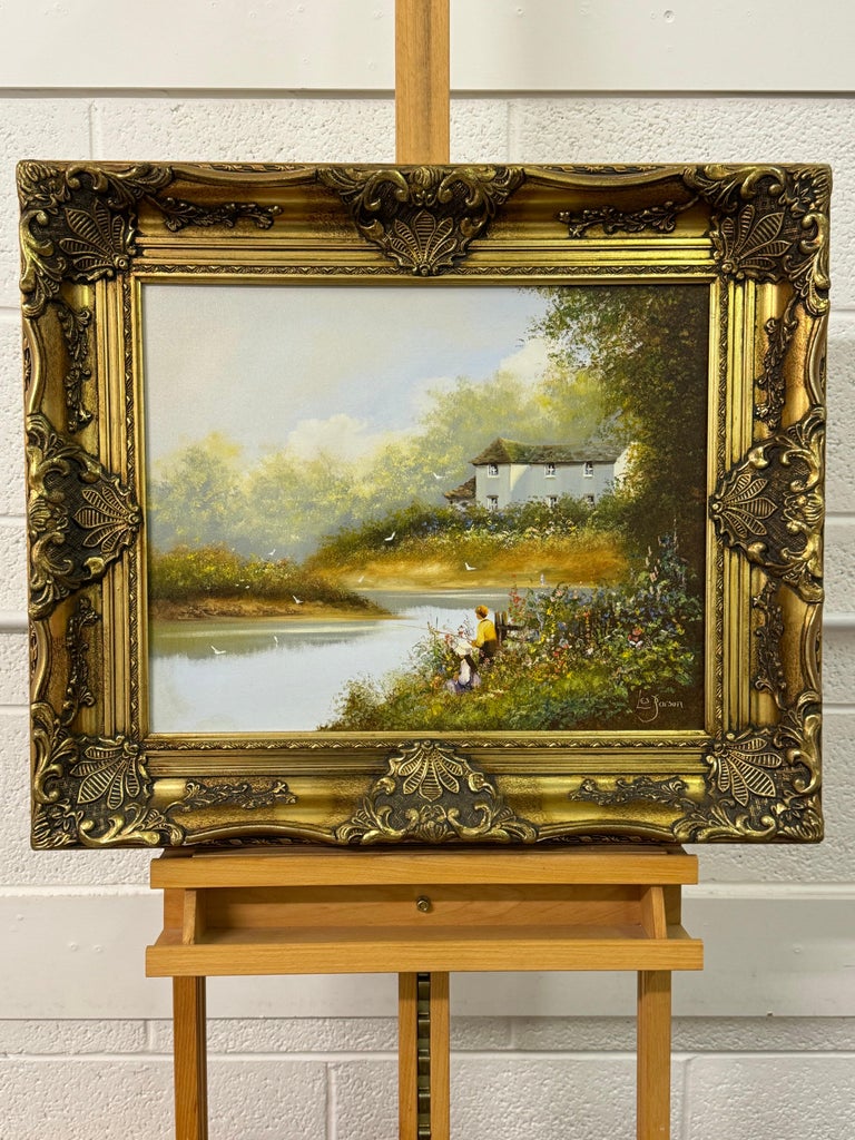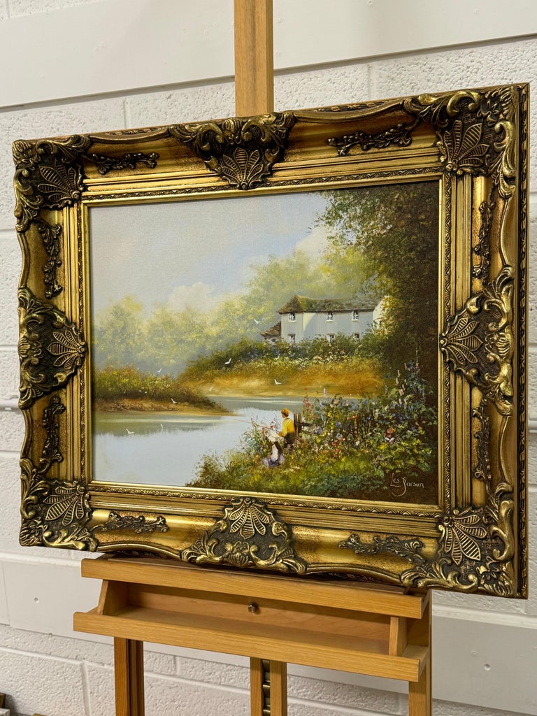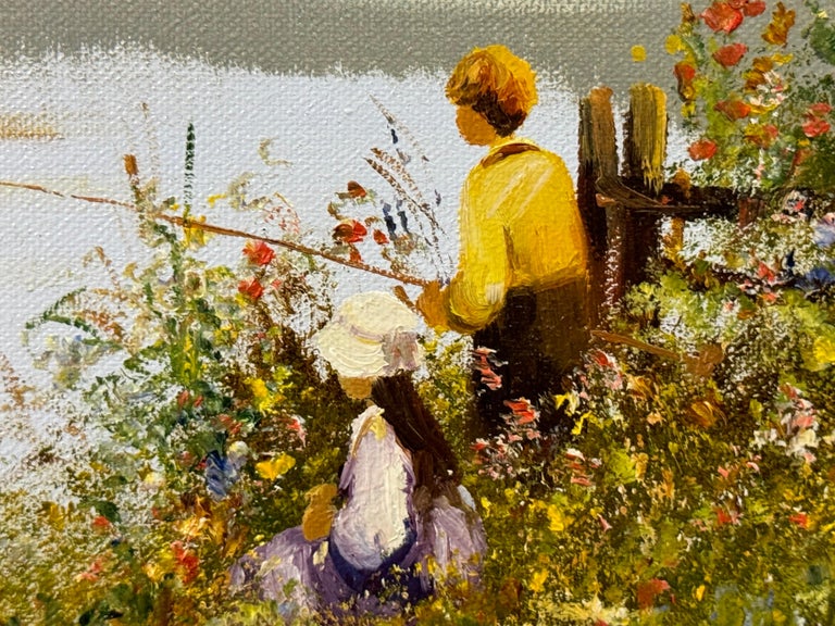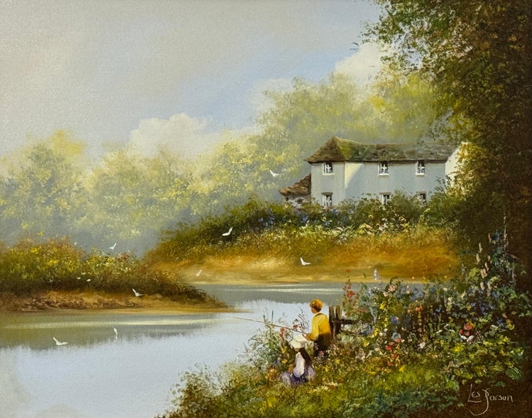 Children Fishing by a Riverside with Wild Flowers & Farmhouse in the English Countryside by British Artist, Les Parson