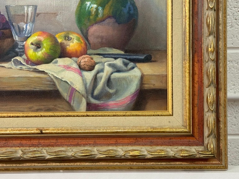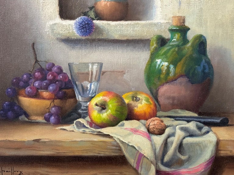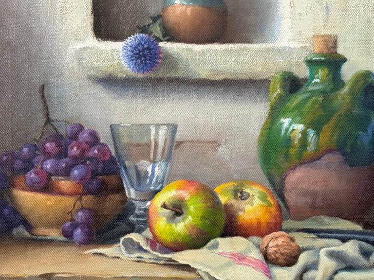 This beautifully crafted oil painting captures a timeless still life scene, blending classic elegance with a serene charm. The artist masterfully uses soft lighting to bring out the natural textures of each object, from the delicate petals of the violet-blue flowers in the earthen vase to the glossy grapes and richly colored apples. The rustic setting, with a stone alcove and weathered table, adds a touch of nostalgia, evoking warmth and simplicity. The muted, earthy tones are complemented by the vibrant greens and purples, creating a harmonious palette that would bring a sense of tranquility and sophistication to any space. Encased in an ornate, double-layered frame, this piece not only showcases the artist’s attention to detail but also invites the viewer to appreciate the beauty in everyday objects.