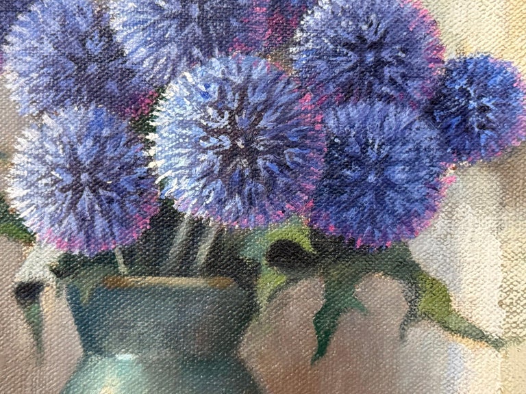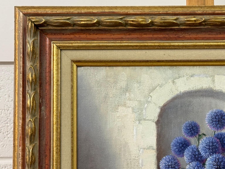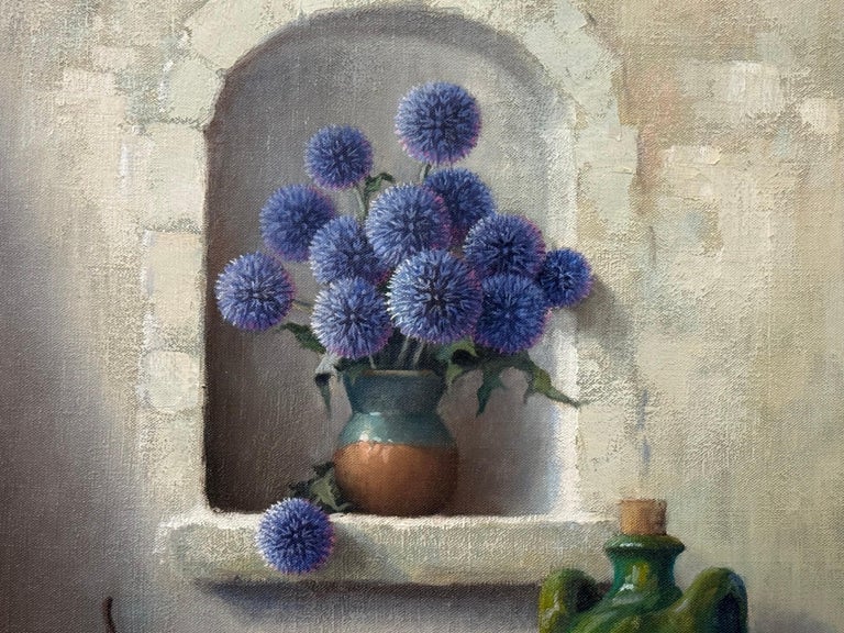 The blue flower depicted in the painting is a globe thistle (Echinops). Globe thistles are known for their distinctive spherical blooms, typically in shades of blue or purple, and are often used in floral arrangements and artwork for their unique shape and vibrant color. Their architectural form adds an elegant yet rustic touch to the composition.