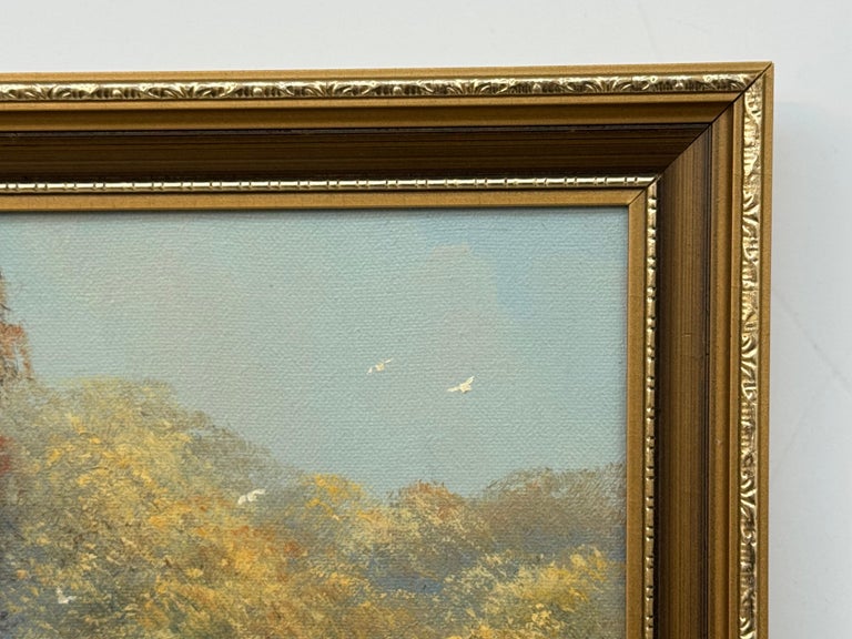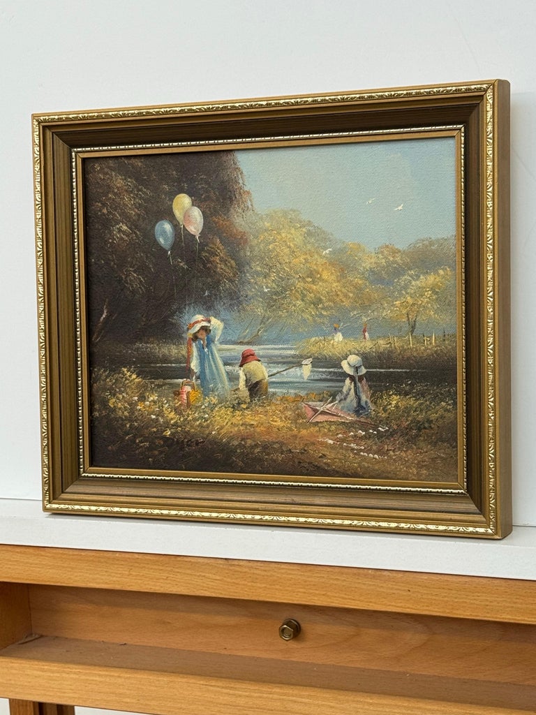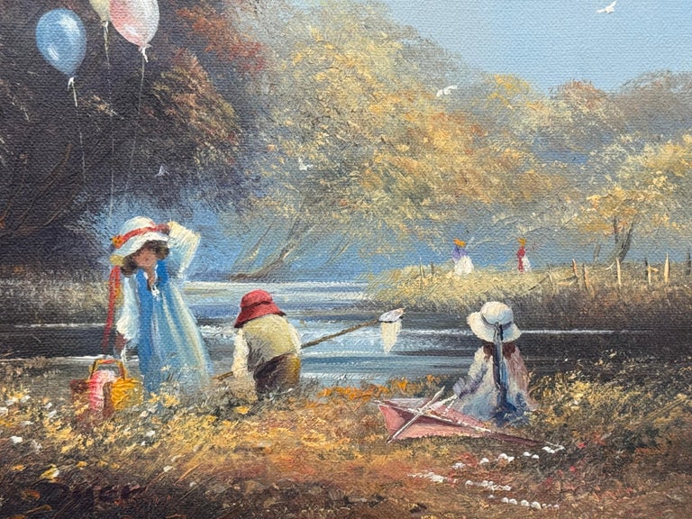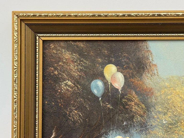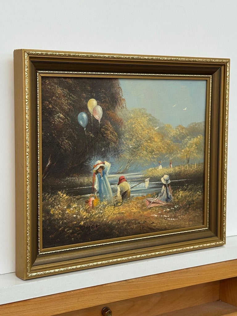 Ted Dyer captures a moment of pure, sunlit nostalgia in this charming oil on canvas, where childhood play unfolds beside a tranquil river under a soft blue sky. Painted with his signature romantic touch, the scene is filled with gentle movement and atmosphere, from drifting balloons caught against dark woodland, to the shimmer of water as it curves through the landscape.