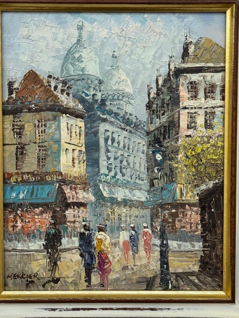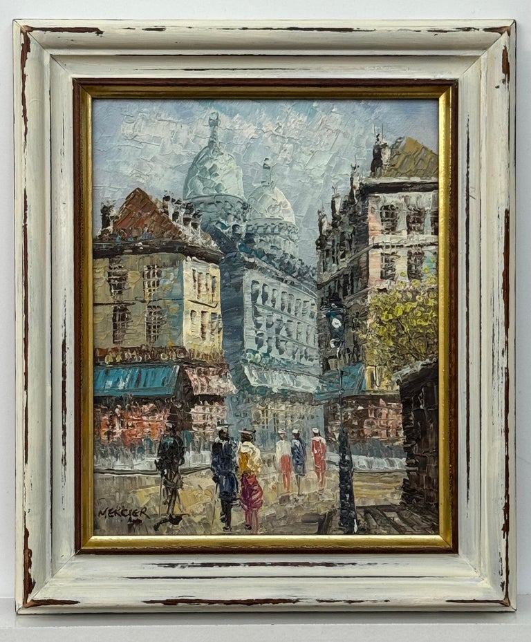 This evocative Parisian street scene captures the quiet theatre of everyday life through Tony Mercier’s richly textured, impressionist approach. Built with confident impasto, the surface carries light across stone façades and soft sky tones, allowing the architecture to rise with a sense of weight and permanence while remaining atmospheric and fluid.