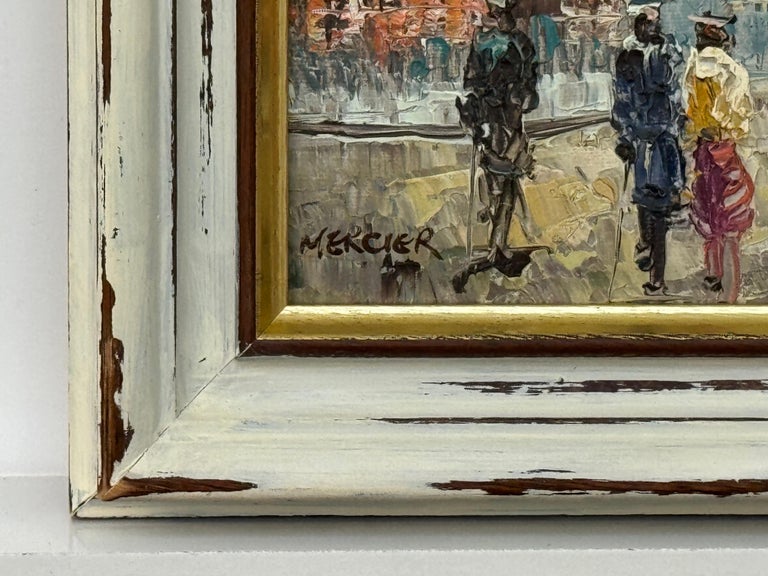 Mercier’s work sits comfortably within a modern impressionist tradition, prioritising atmosphere, memory, and rhythm over strict detail. The painting is presented in a distressed white frame with a gilt inner slip, which enhances the nostalgic character of the piece and complements its colour palette beautifully.
